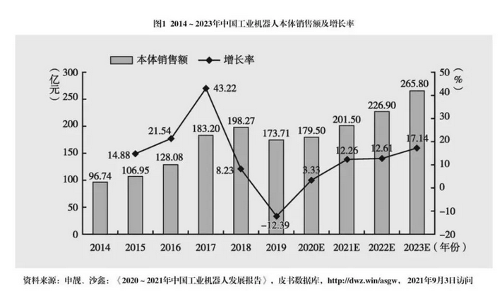 需求方面,国家政策的支持和智能制造加速升级,使工业机器人市场规模持续迅速增长。根据2019年8月中国电子学会发布的《中国机器人产业发展报告2019》,我国生产制造智能化改造升级的需求日益凸显,工业机器人需求依然旺盛,我国工业机器人市场保持向好发展,约占全球市场份额三分之一,是全球第一大工业机器人应用市场。另外,根据国际机器人联盟(IFR)统计,我国工业机器人密度在2017年达到97台/万人,超过全球平均水平,并将在2021年突破130台/万人,达到发达国家平均水平。如图1所示,从长期来看,制造企业对工业机器人仍有巨大需求,机器人价格下行的态势也将延续。在“量增价降”综合因素作用下,工业机器人本体销售额平稳增长,预计到2023年将达265.8亿元。此外,随着部分西方国家对华扼制战略的推进,我国工业机器人在快速发展的同时,也在加快工业机器人伺服电机、减速器、控制器等关键部件的国产替代。工业机器人核心部件国产化,也将成为未来发展的重要趋势。